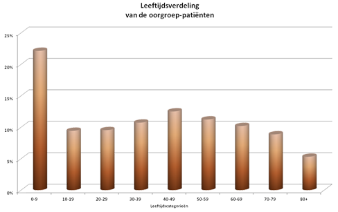 De patiënten van de oorgroep komen vanuit gans Vlaanderen en daarbuiten (zie onderaan voor grafiek). De patiënten zijn van alle leeftijden (zie onderaan voor grafiek). Door de bijzondere expertise in het onderzoeken van kinderen is bijna een kwart evenwel jonger dan 10 jaar. Er worden ongeveer 1000 dragers van een cochleair implant gevolgd en maandelijks komen er ettelijke nieuwe kandidaten bij.